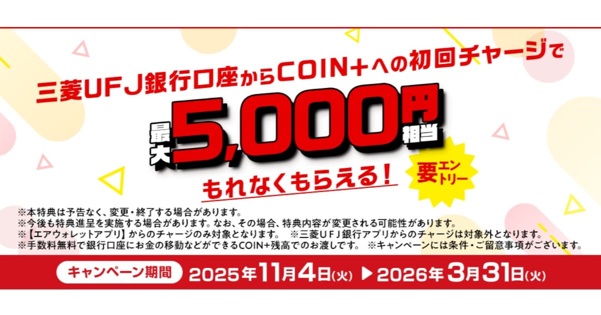 三菱UFJ銀行からCOIN+にチャージで5000円貰えるキャンペーンをご紹介