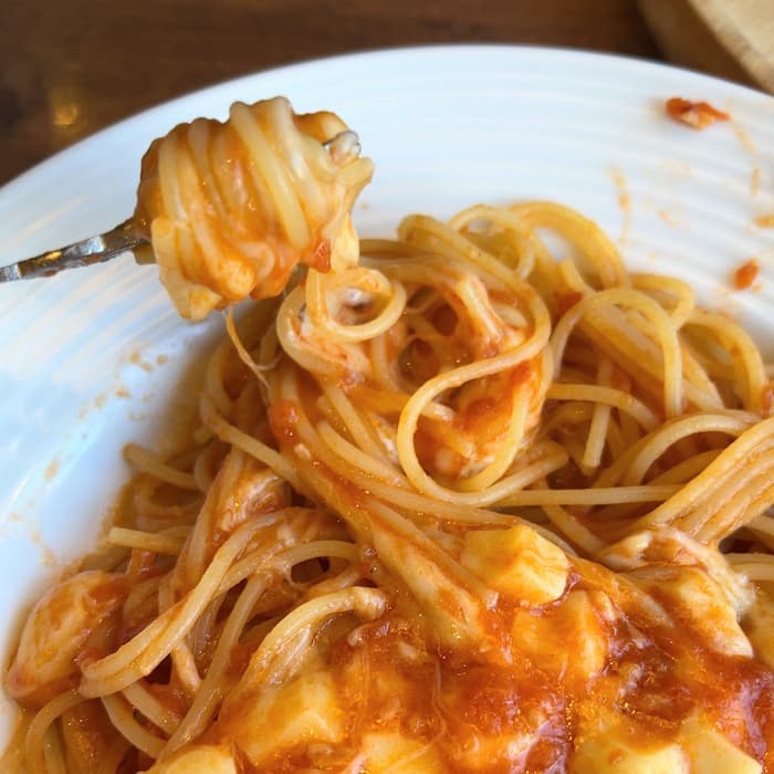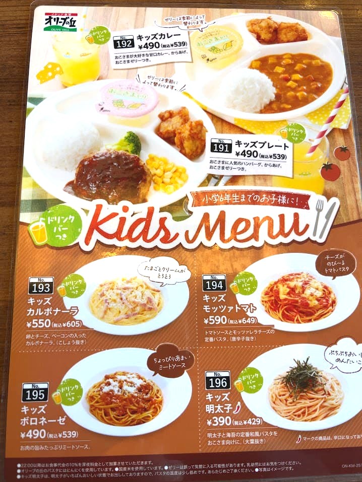 小学生6年生まで食べられるキッズメニュー。ドリンクバー付きで子供サイズのパスタがあるのが嬉しいですね。