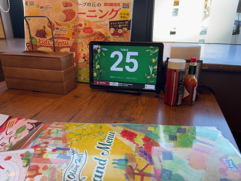 タッチパネル式で注文楽々。テーブルにはタバスコと粉チーズが備え付けられていました。