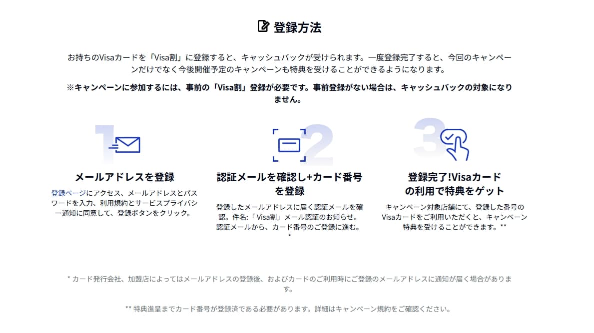 Visa割チャンスへの参加には、事前にVisa割にメールアドレスとカード番号の登録が必要です。